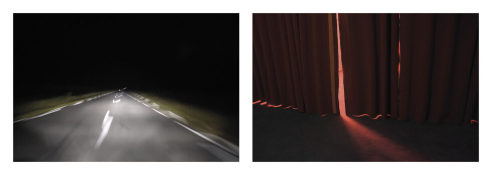 Ces diptyques photographiques, empreintant à la grammaire cinématographique, créent une trame hybride diluant les cadres, et permettent grâce à l’évidement du contenu plastique la mise en mouvement de l’imagination, de scénarios possibles. Les diverses interventions numériques ne sont jamais ostentatoires, leurs effets se fondent dans la plasticité de l’image et révèlent un trouble quant à la nature de celle-ci. Face à l’éloquence des images, il convient de dissoudre le discours en soulignant l’évidence d’images ouvertes sur l’objet du désir de voir, objet paradoxal se nourrissant inlassablement de sa propre évanescence.