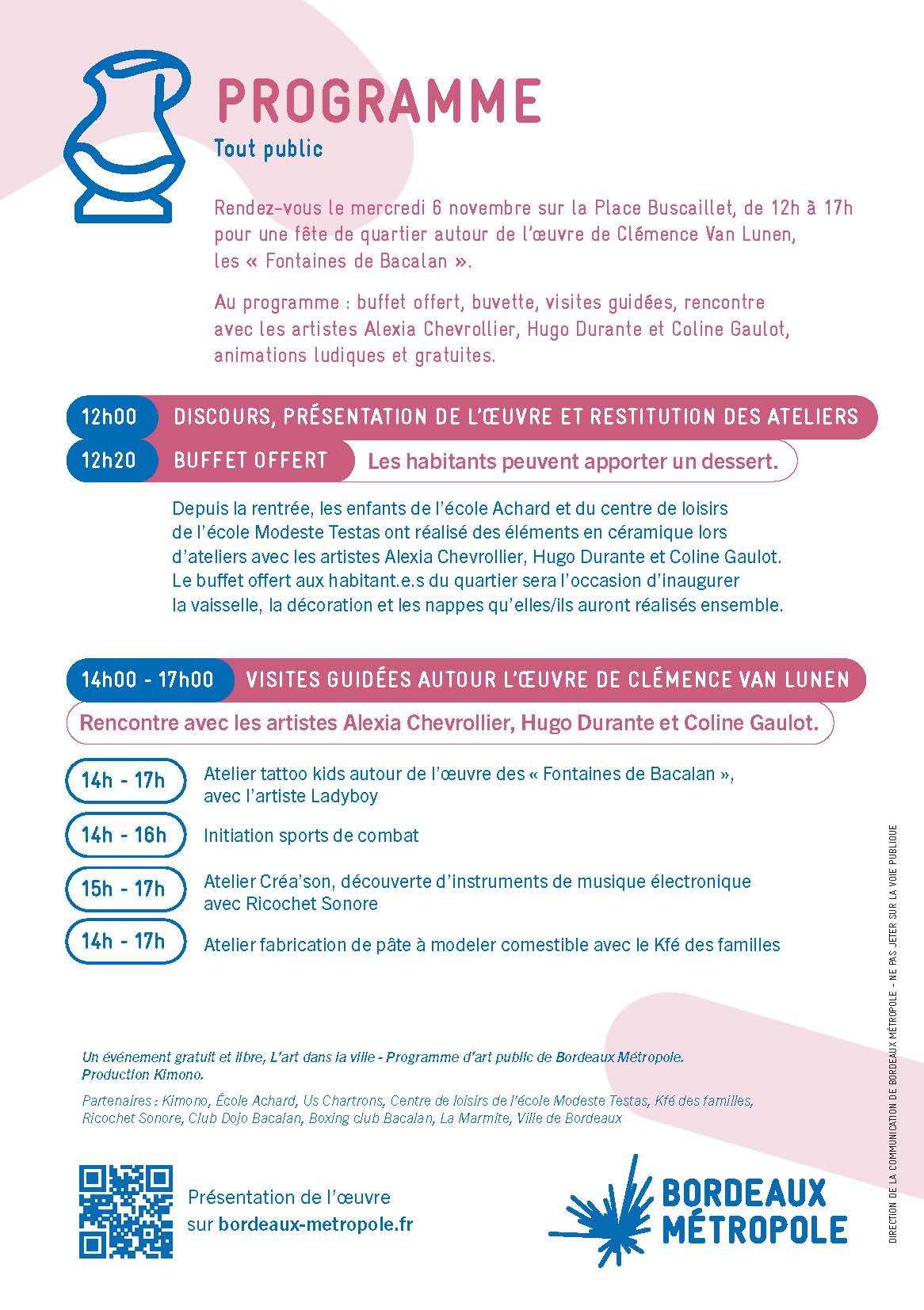 Rendez-vous le mercredi 6 novembre sur la Place Buscaillet, de 12h à 17h pour une fête de quartier autour de l'œuvre de Clémence Van Lunen, les « Fontaines de Bacalan ».