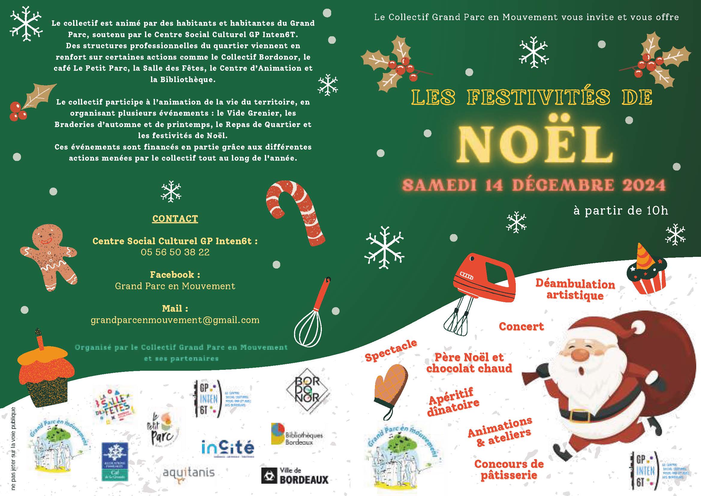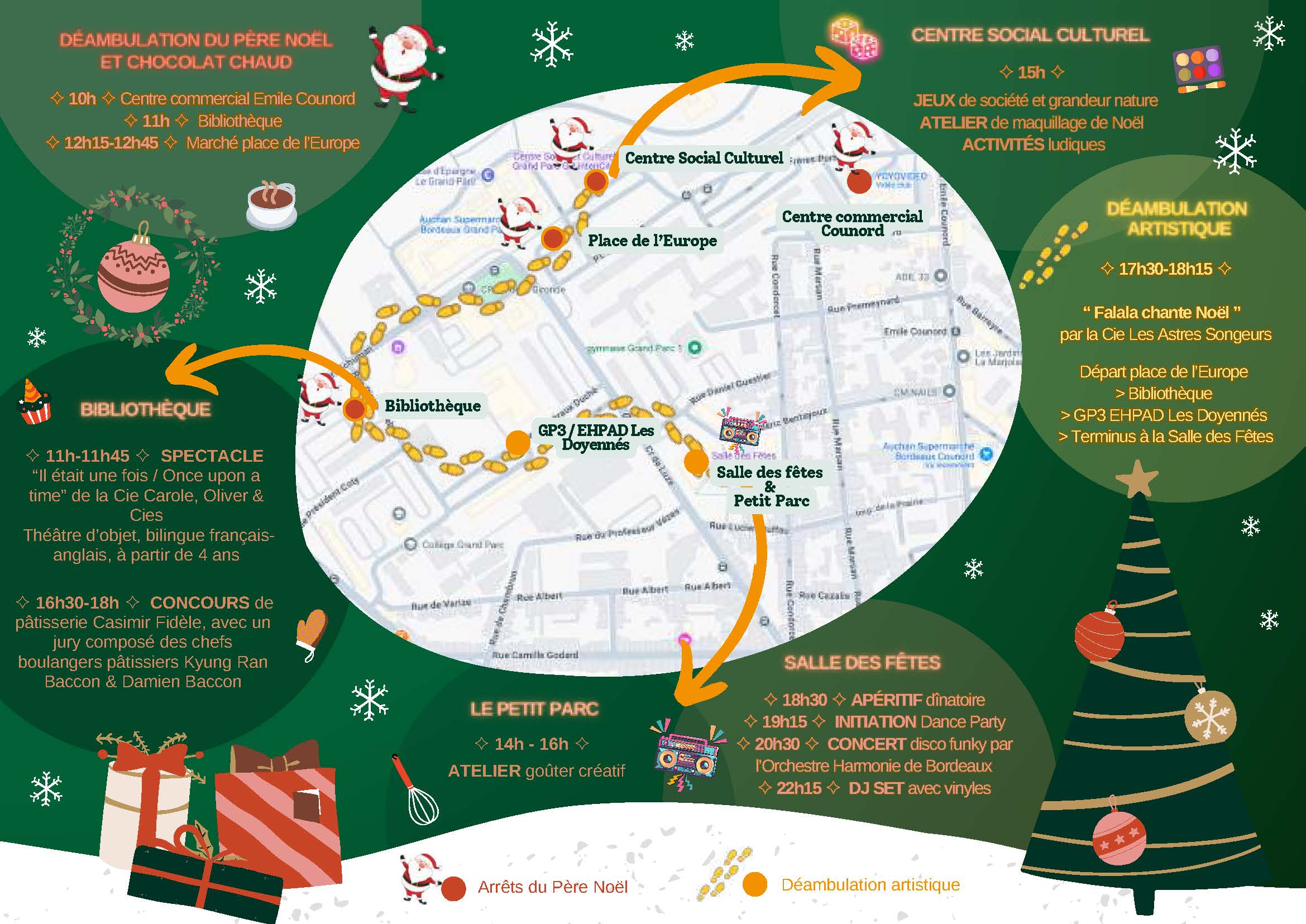 Au programme : une déambulation du Père Noël le matin, des activités ludiques l'après-midi suivis d'une déambulation spectacle dans le quartier. En soirée, rendez-vous à la salle des fêtes du Grand parc pour un concert et un DJ set !