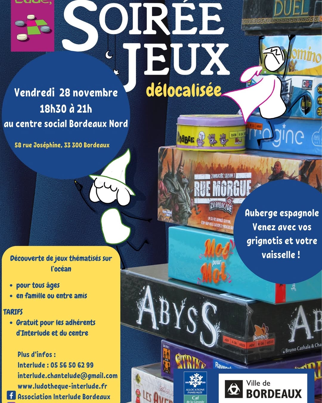 Vendredi 28 novembre 2025, de 18h30 à 21h30, retrouvez l’équipe Interlude au Centre Social Bordeaux Nord pour une soirée-jeux délocalisée !