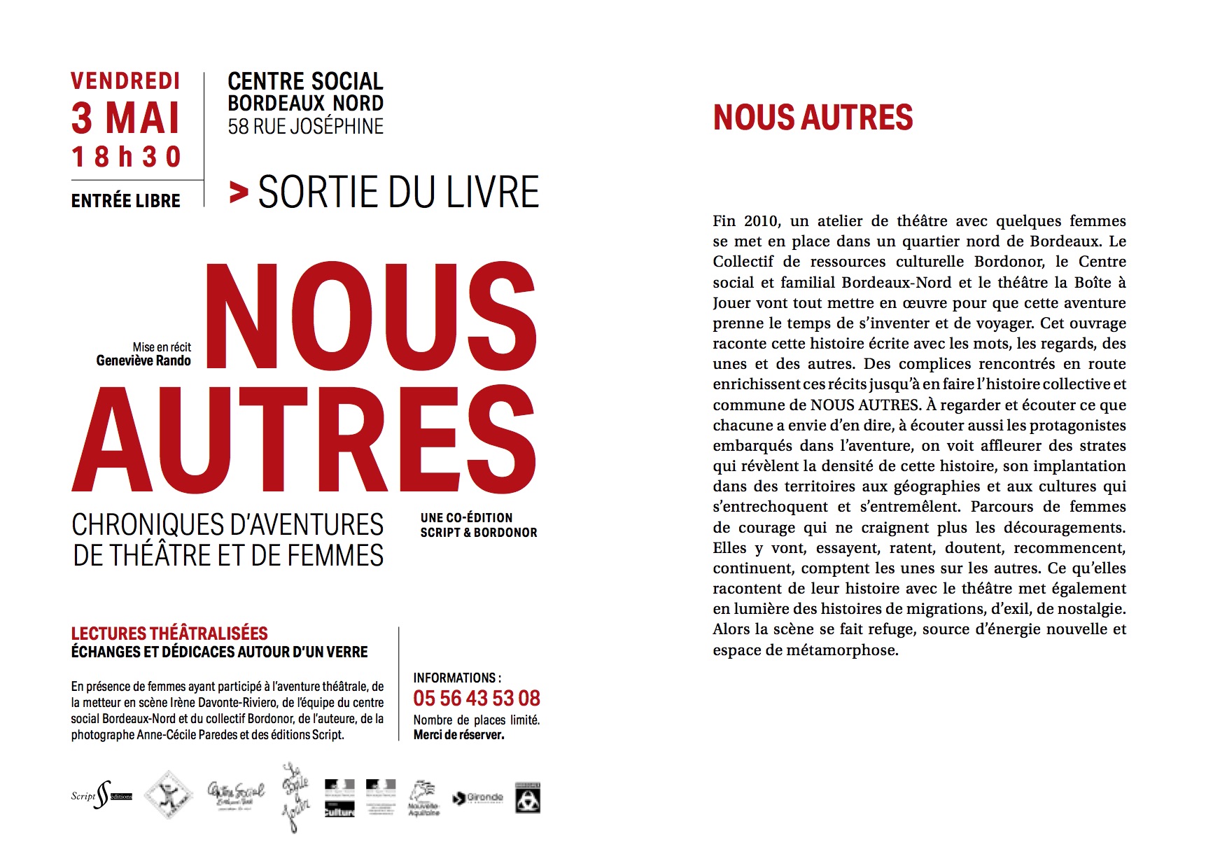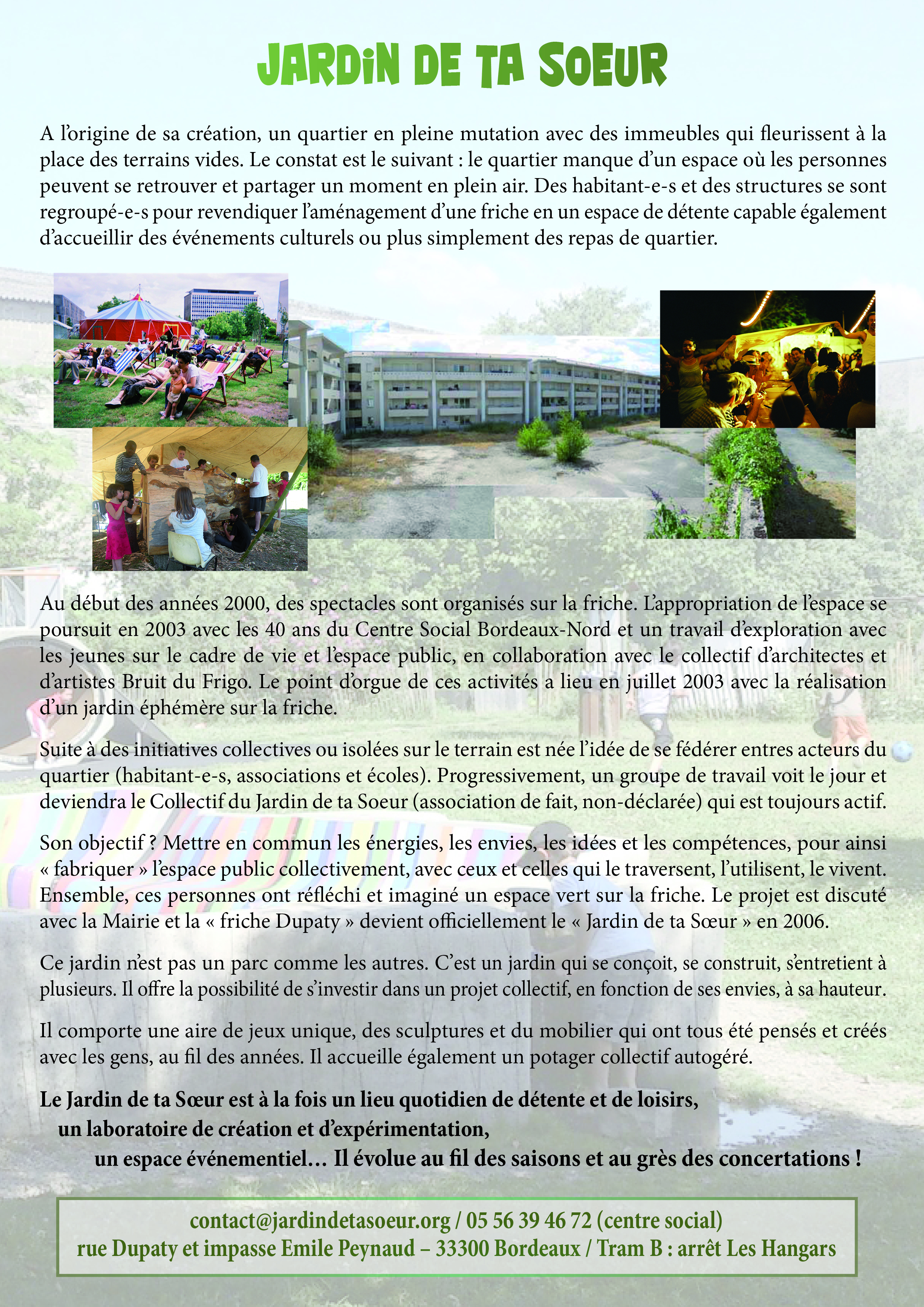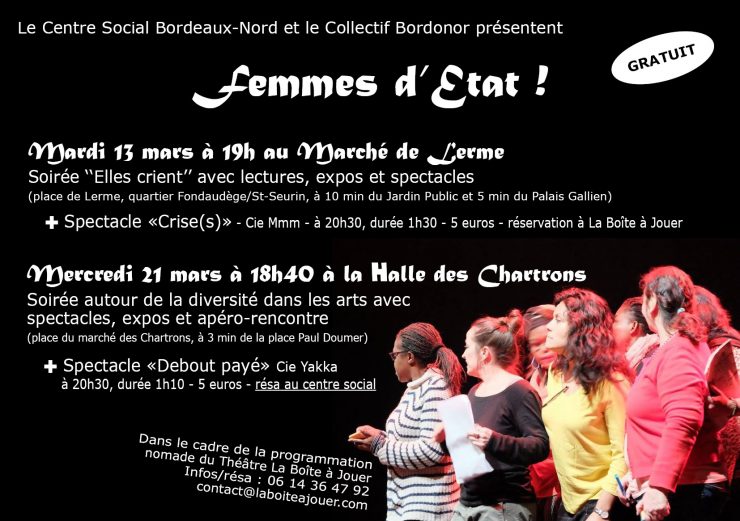 Augmentation des sorties tout public sur des lieux hors quartiers nord (Rocher de Palmer, IDDAC, …). Rencontres avec les artistes programmés par la Boite à Jouer au CSBN. Création du spectacle « Femmes nouvelle collection » (atelier théâtre femmes du CSBN). Manifestation « Bordonor se met au vert » sur le jardin de ta sœur.