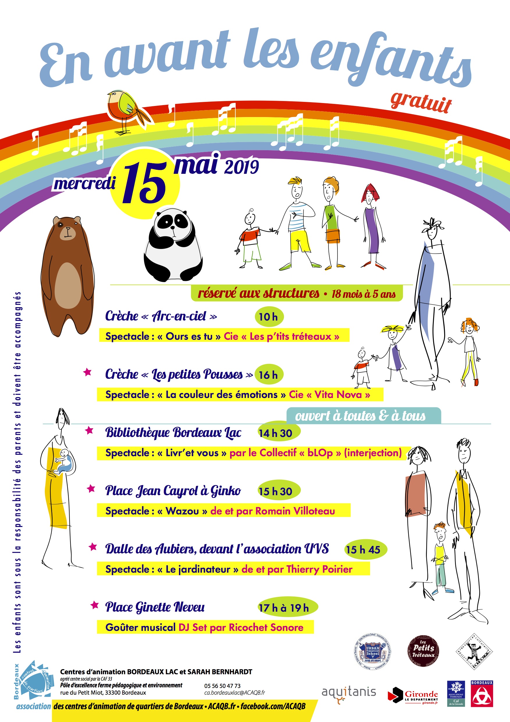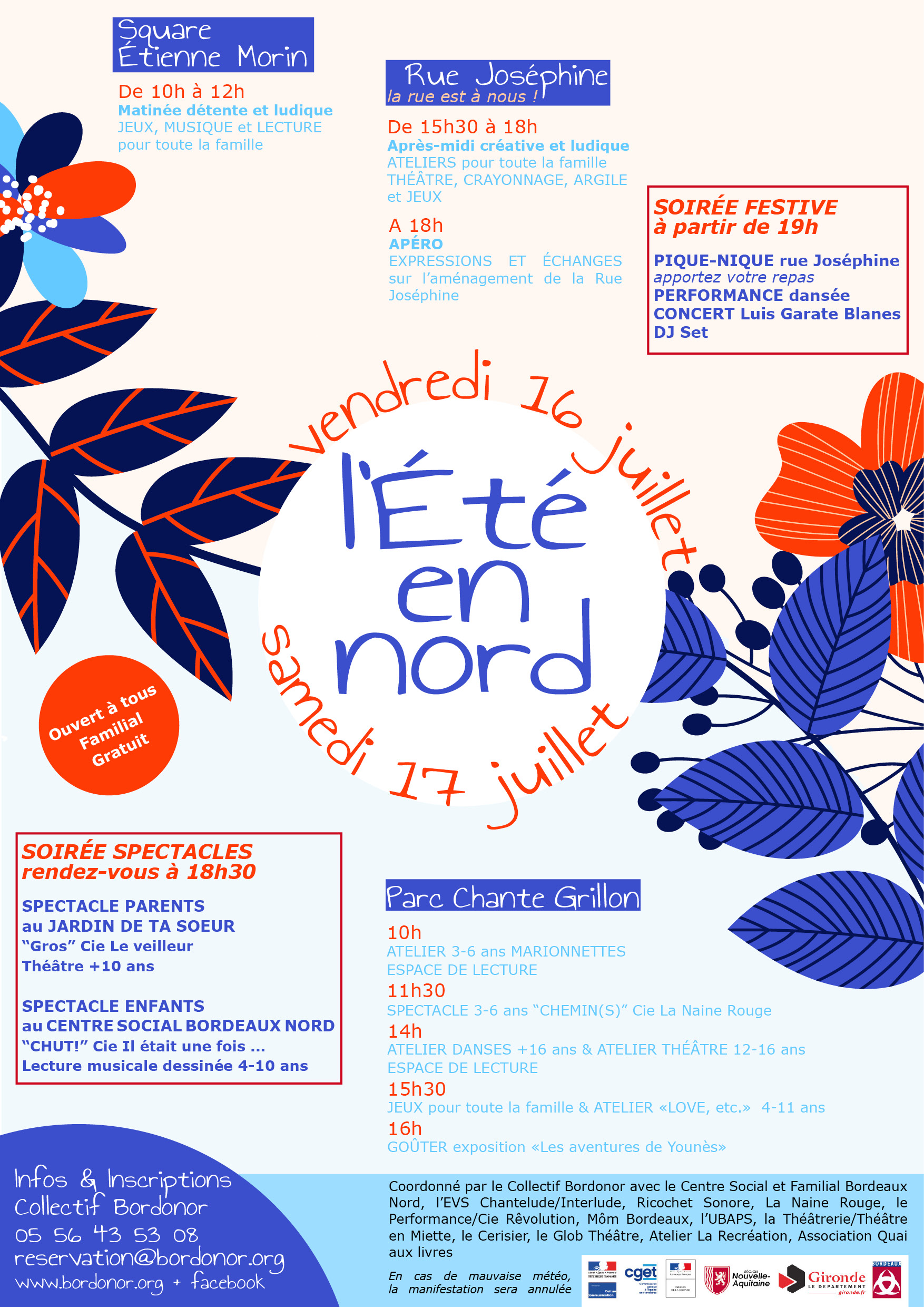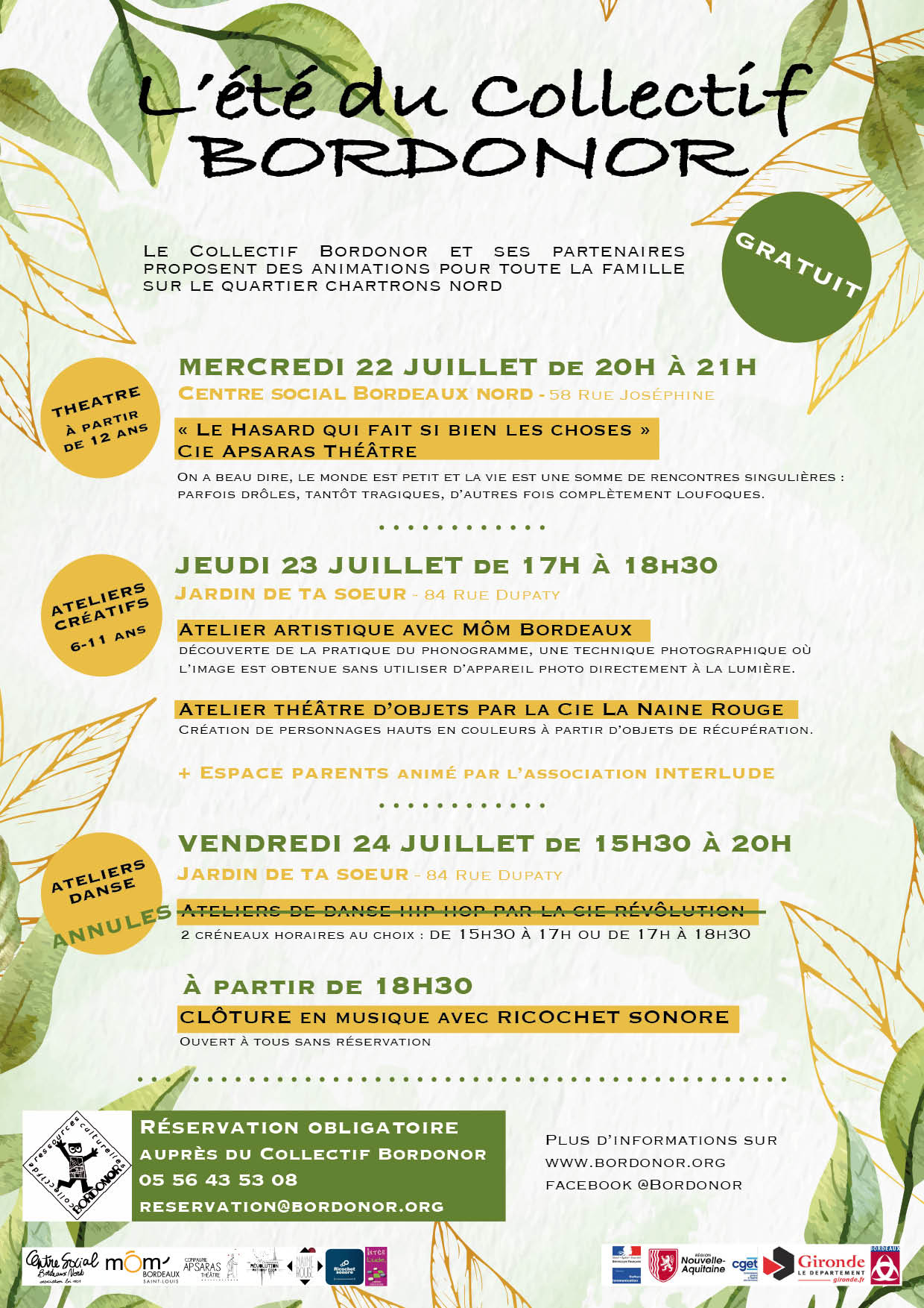 Augmentation des sorties tout public sur des lieux hors quartiers nord (Rocher de Palmer, IDDAC, …). Rencontres avec les artistes programmés par la Boite à Jouer au CSBN. Création du spectacle « Femmes nouvelle collection » (atelier théâtre femmes du CSBN). Manifestation « Bordonor se met au vert » sur le jardin de ta sœur.