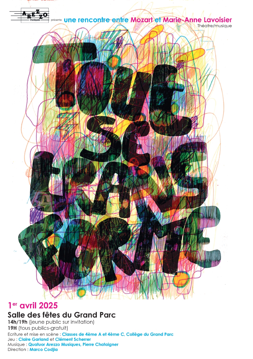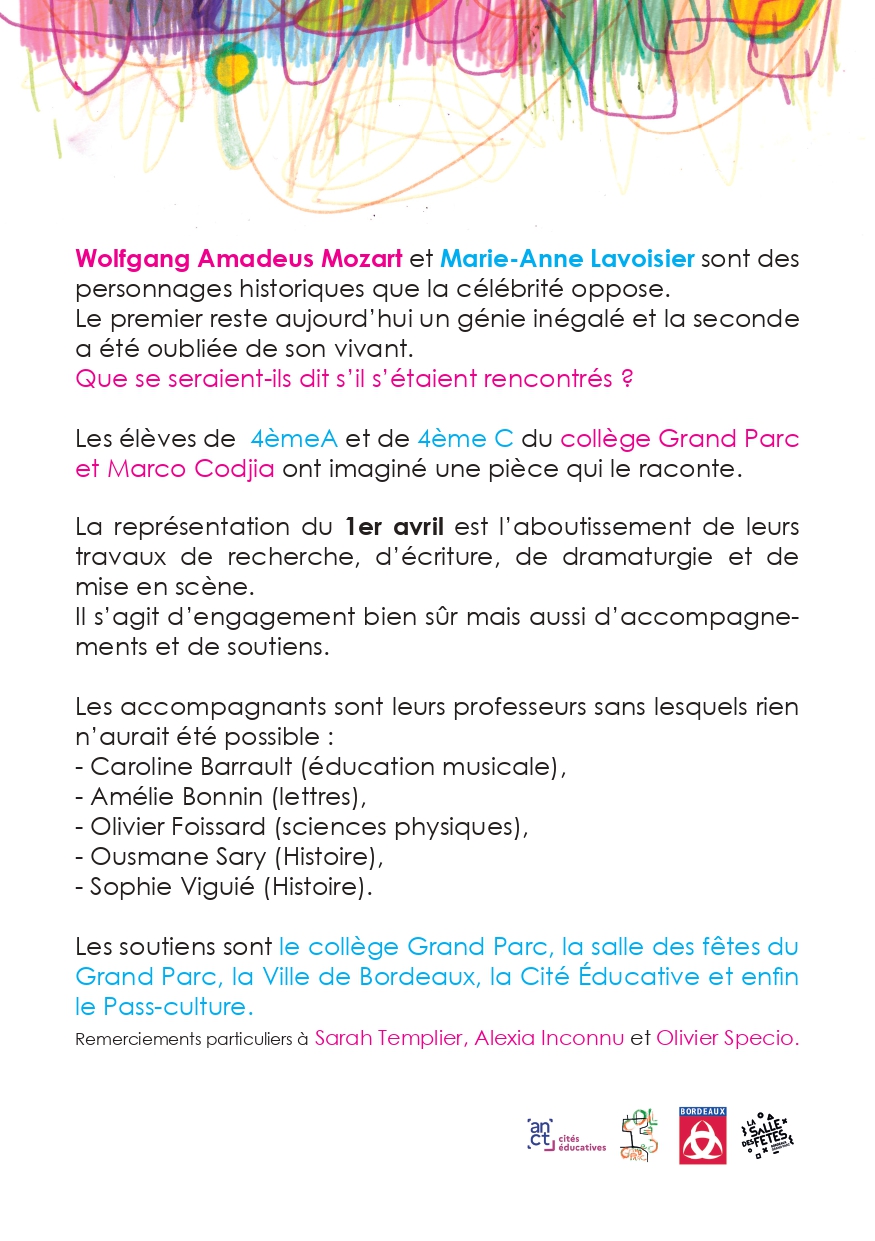 Cette œuvre de théâtre musical interprétée par quatre musiciens (trois cordes et un hautbois) et deux comédiens (tous professionnels) met en scène la rencontre imaginaire entre Anne-Marie Lavoisier et Mozart. Ce projet est le fruit de la collaboration entre les élèves de 4ème du collège Casimir Fidèle (Grand Parc), l'artiste Marco Codjia (Arezzo musiques) et l'équipe enseignante du collège.