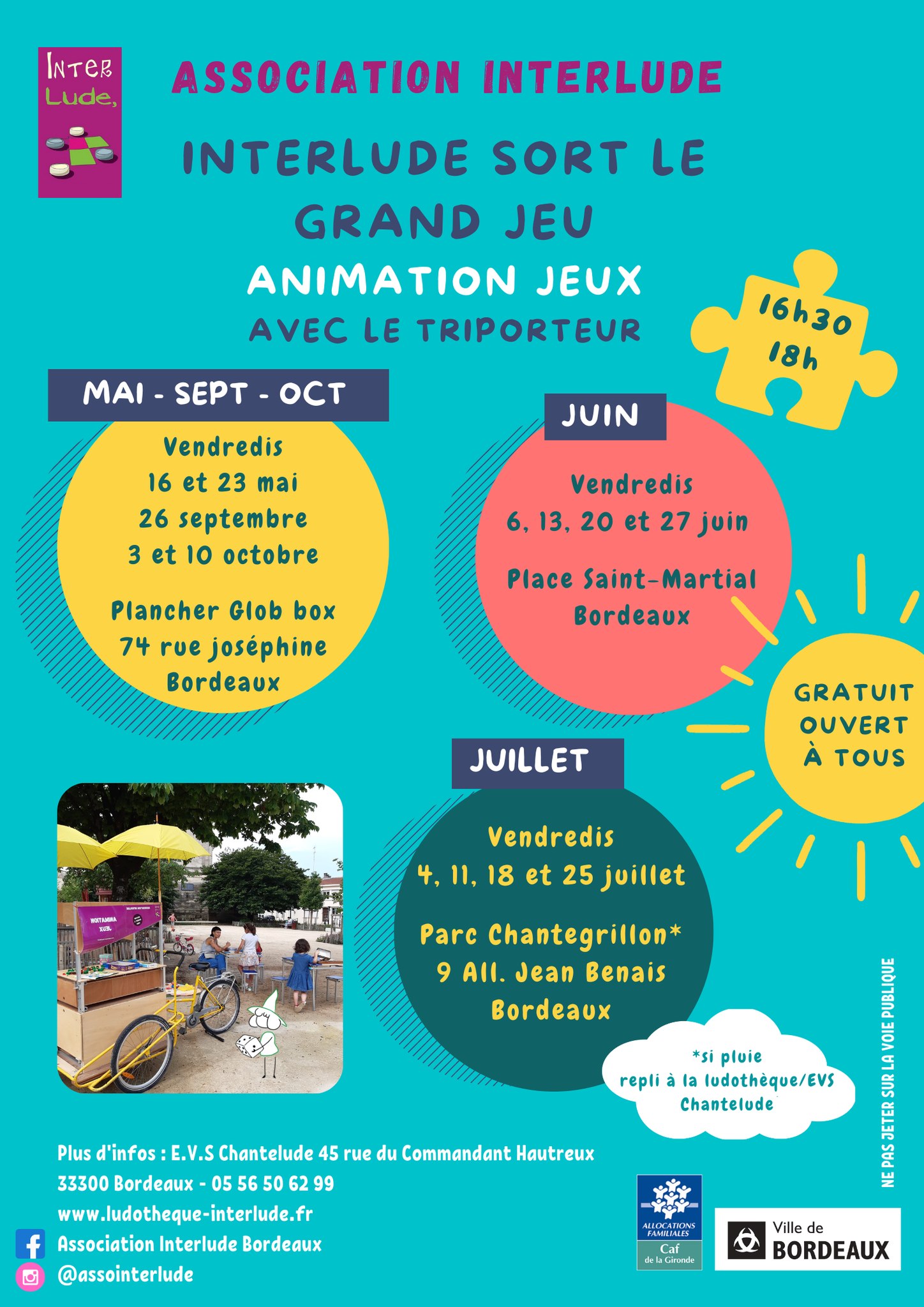 Interlude sort le Grand Jeu : animation jeux avec le triporteur sur le plancher du Glob Box (quartier Chartrons Nord) de 16h30 à 18h